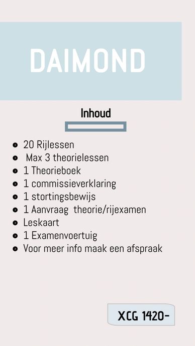 Dit pakket is geschikt voor autobestuurders met veel rijervaring.Het is mogelijk om in twee of drie termijnen te betalen, met een eerste aanbetaling van XCG 250.