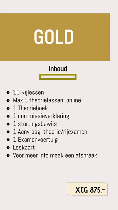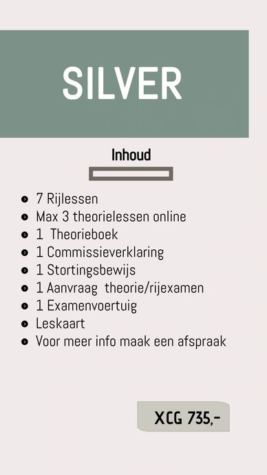 Dit pakket is geschikt voor autobestuurders met weinig rijervaring. Betaling is mogelijk in twee of drie termijnen, met een eerste aanbetaling van XCG 250.