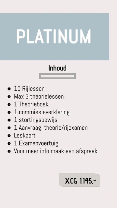 E pakete aki ta speshal pa personanan ku nan rijbewijs a vense pa mas ku 3 aña. Por paga den 2 termino ku un prome pago di XCG 250.